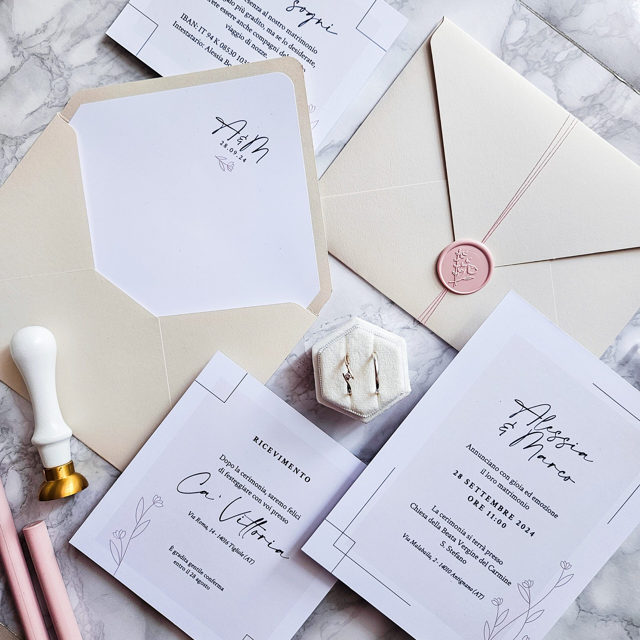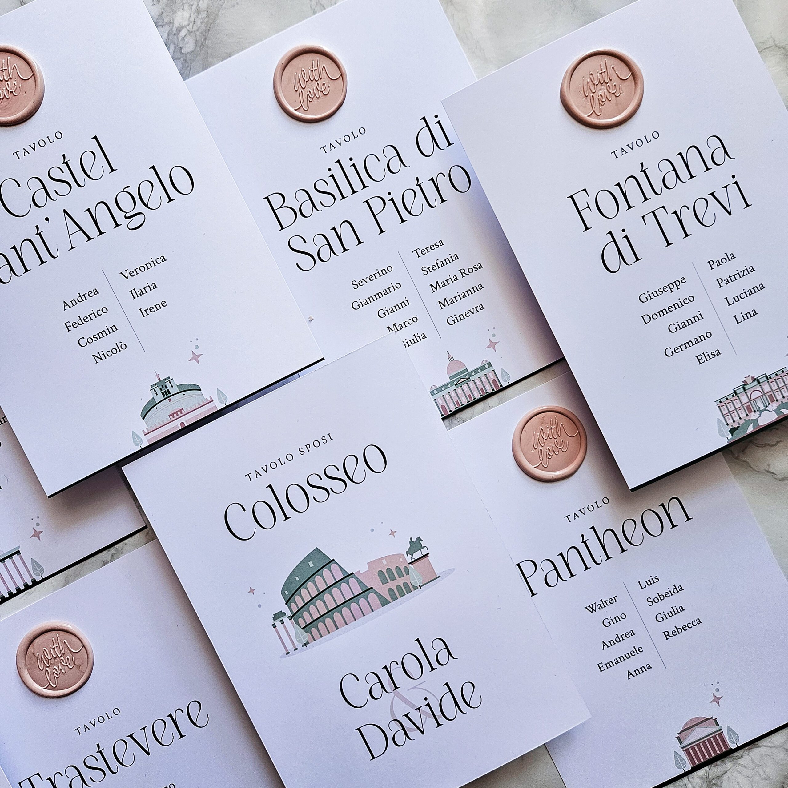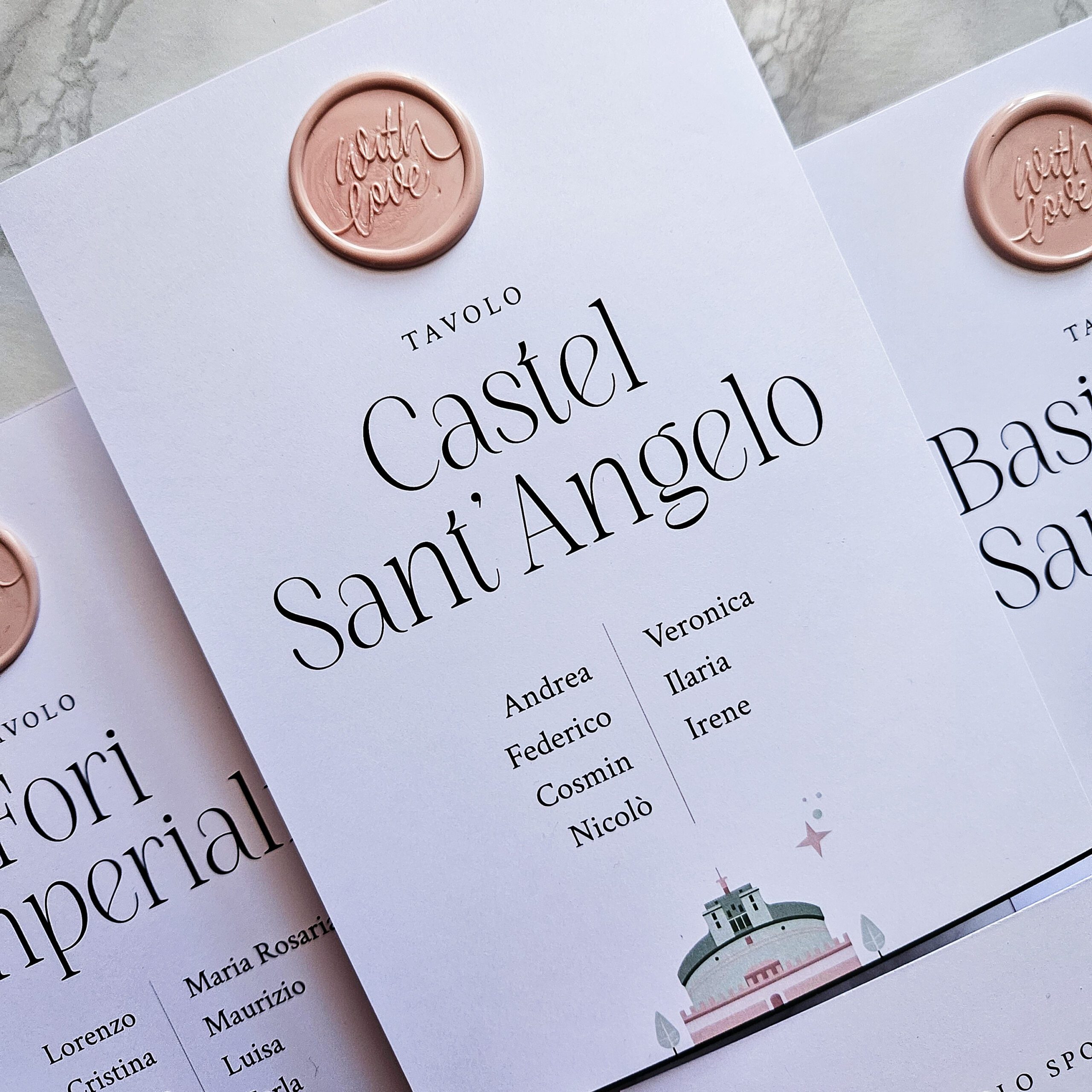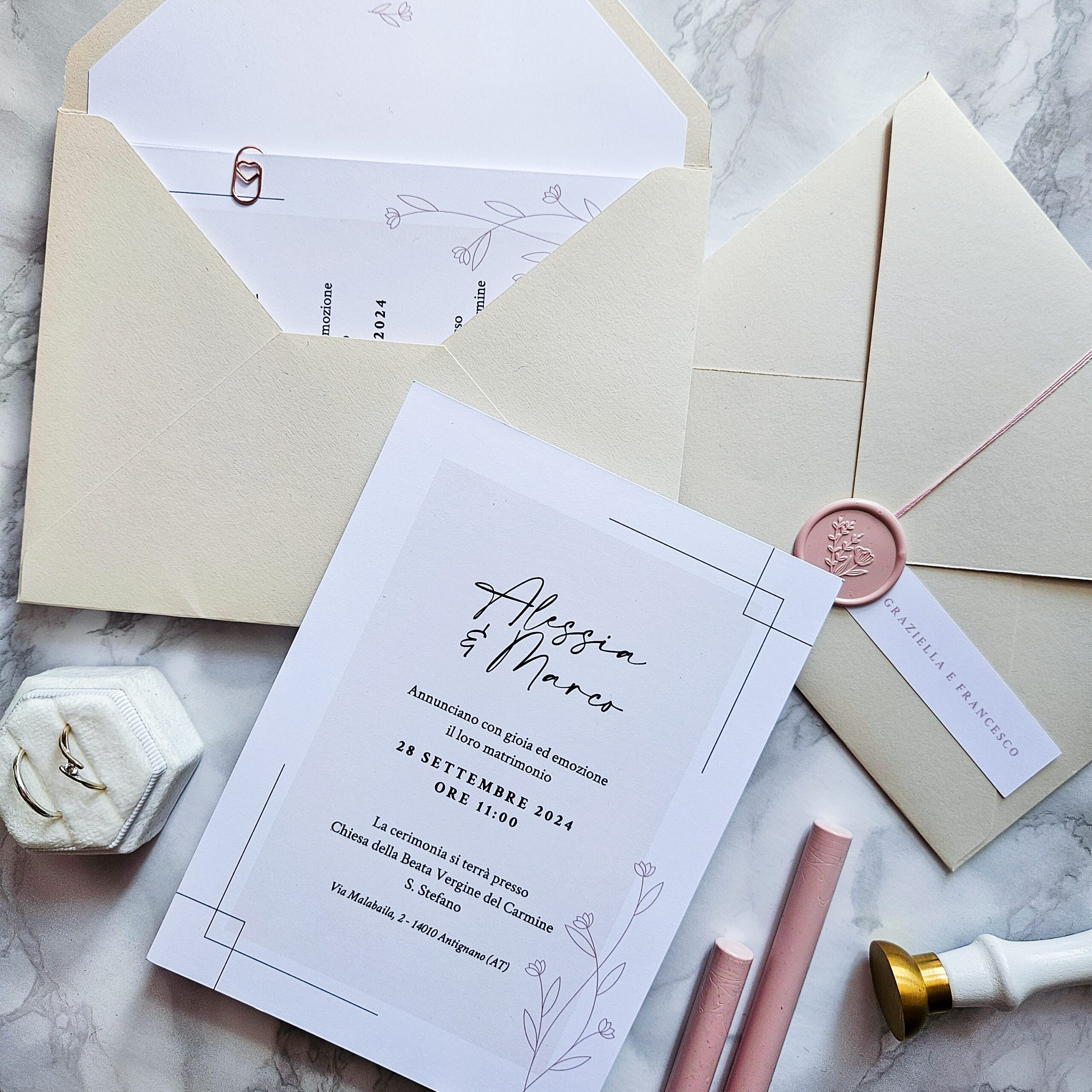 Offro coordinati di matrimonio sia semi-personalizzati da catalogo, che progetti personalizzati per gli sposi che preferiscono una grafica unica che li rappresenti al 100%.